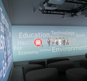 Eight EH503 ProScene projectors with short throw lenses were discreetly ceiling mounted to project the continuous 360 degree video around the walls, giving students a feeling of actually being at the centre of political history.