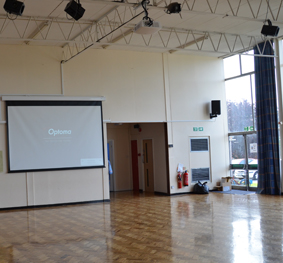 The projector was connected to an input wall plate that has VGA, HDMI and composite inputs ensuring connectivity to all sources the school would need. Speakers around the hall are connected using the audio output and the imagery is projected onto a 3m wide electric screen.
