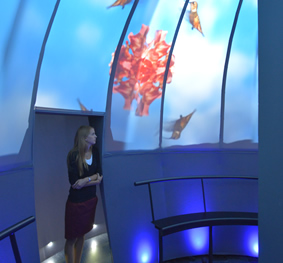 By back-projecting the imagery, the projectors are out of sight to visitors so that the experience is completely immersive. The short throw lens used in the projectors has a throw ratio of 0.8:1 and is ideal for rear-projection installations.