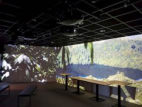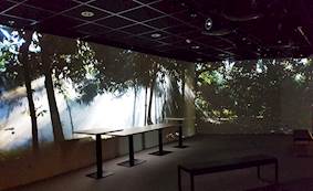 Three walls of the immersive room were projected onto.  The entire space measuring 21 square metres.  2.6 metres high by 7 metres wide with the other two walls measuring 4 metres wide.